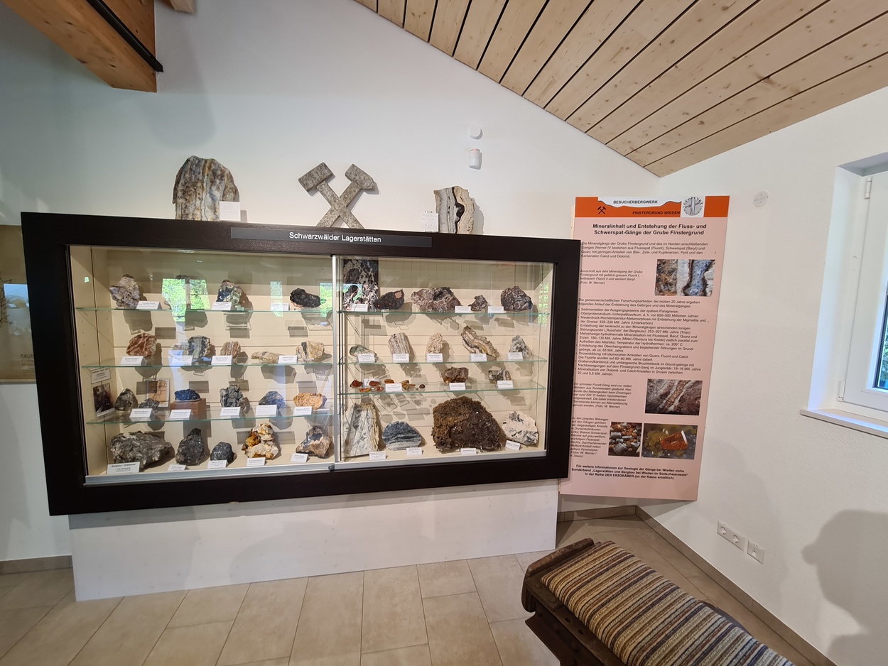 Das neue Infozentrum Bergbau und Geologie kann zu den regulären Öffnungszeiten des Besucherbergwerks Finstergrund besichtigt werden. Auf weit über 100qm Fläche im Obergeschoss des Besuchergebäudes direkt vor dem Eingang zum Besucherbergwerk können auf zwei Etagen alle Aspekte der regionalen Bergbaugeschichte bestaunt werden. Von der Geologie über die Bergbautechnik bis hin zur Verwendung der Rohstoffe wird ausgiebig auf die Themen eingegangen, mit vielen Originalartefakten aus der Betriebszeit wie z.B. ein historischer Schnabelkipper oder der historische Schreibtisch des damaligen Repräsentant des Bergwerksbetreibers, der Gewerkschaft Finstergrund. Besondere Ausstellungsgegenstände wie originale Postkarten oder Dokumente aus der Betriebszeit sowie Großstufen aus dem Revier runden zusammen mit interaktiven Multimediabildschirmen -auf welchen u.a. Interviews mit Zeitzeugen und historische Bilder angeschaut werden können- die Ausstellung ab. Für Kinder ist eine Malecke eingerichtet. Lassen Sie Sich vor oder nach der Grubenfahrt im Besucherbergwerk von der vielfältigen und interessanten Bergbaugeschichte begeistern.