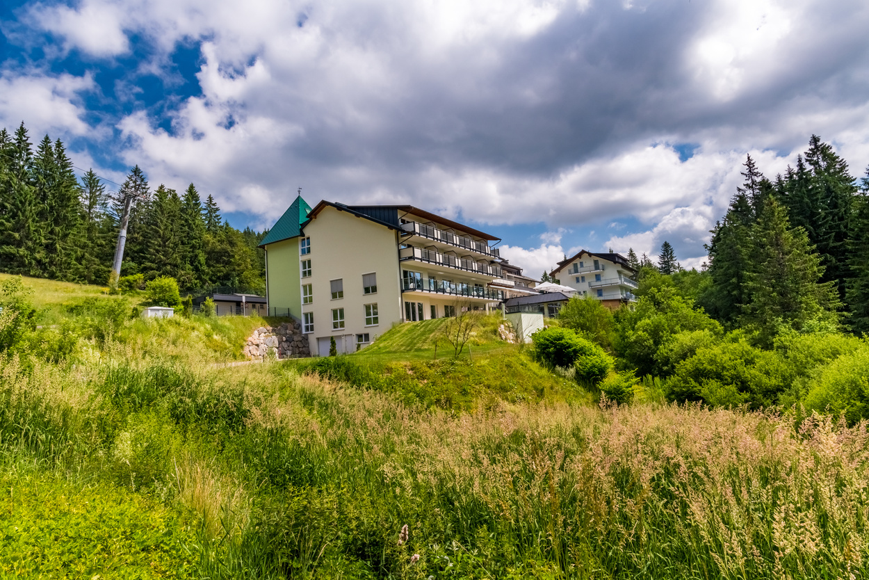 Belchenhotel - Außenansicht Belchenhotel Jägerstüble - Außenansicht des Belchenhotel Jägerstüble mit Außenpool und Beleuchtung in der Dämmerung Außenansicht des Belchenhotel Jägerstüble  - Belchenhotel Jägerstüble mit Belchengondel im Vordergrund  - Außenansicht des Anbau Belchenhotel Jägerstüble - Belchenzimmer Deluxe - Zimmerbeispiel  - Doppelzimmerbeispiel - Doppelzimmerbeispiel  - Hotel - Lobby mit Kamin  - Hallenbad im Belchenhotel - Erholung Pur im Massageraum  - Massageraum mit Liege  - Rezeption - Frühstücksbuffet - Kulinarik - Köche beim Anrichten von Dessertteller Kulinarik - ein angerichteter Speiseteller Belchen entdecken - Belchenseilbahn - Belchenzimmer Classic -