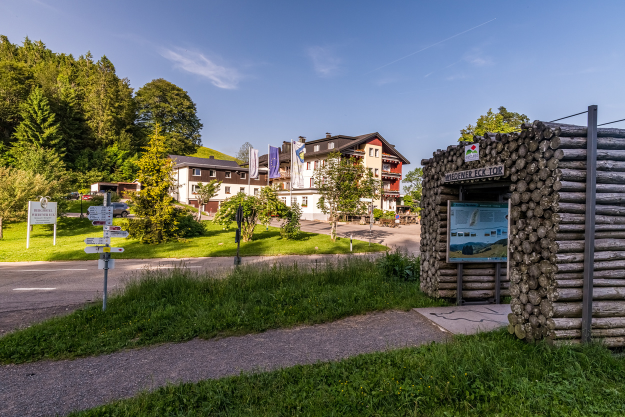 Aussenansicht des Hotel Wiedener Eck  - Wiedener Eck Westwegtor im Hintergrund das Hotel Wiedener Eck - Familie Wissler - (v.l.n.r. Martin und Maria Wissler, Marie und Lorenz Wissler) Juniorsuite - Komfort-Doppelzimmer - Komfort-Doppelzimmer - Juniorsuite - Panoramastube - Weinservice am Tisch eines Gastes  - Historische Bauernstube - Junior-und Küchenchef Lorenz beim Spätzle schaben - Hauseigener Räucherofen - Leckere hausgeräucherte Schinken, Speck und Salami vom Wiedener Reh und Wildschwein. Hausgebackenes Holzofen-Brot - Kulinarik - Sauna - Wellness - Hauseigene Jagd - Bei uns ist eine sorgfältige Hege und Pflege des Wildes, sowie eine saubere Wertschöpfungskette an der Tagesordnung. Blick nach Wieden vom Hotel - Familie Wissler - (v.l.n.r. Maria und Martin Wissler, Lorenz und Marie Wissler) lang lang ist´s her und trotzdem noch genauso schön. -