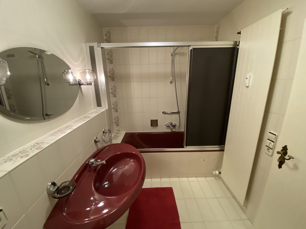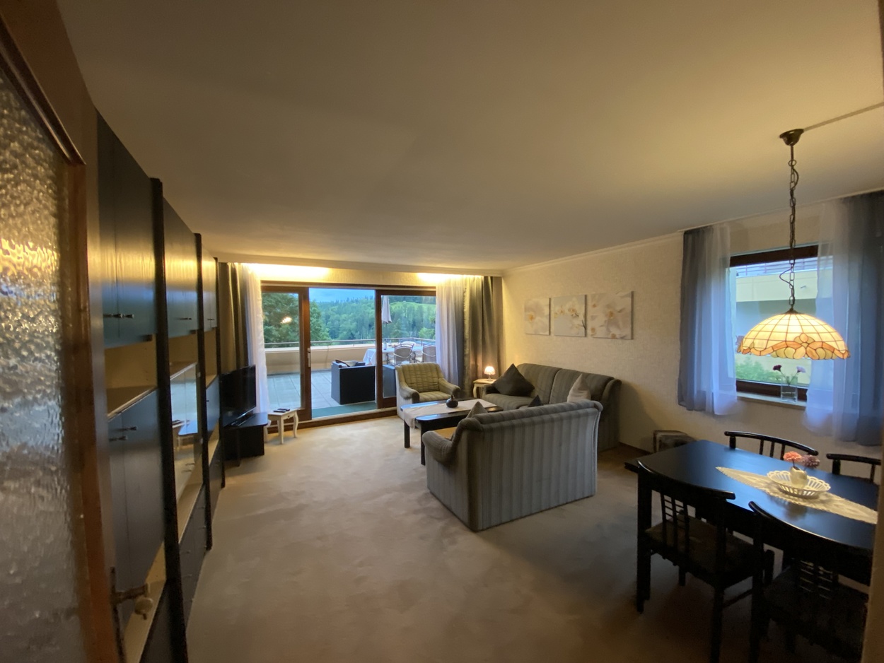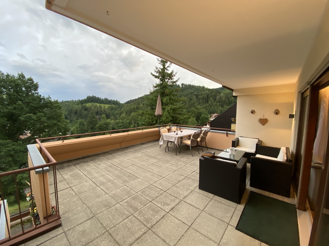 Blick auf das Mehrfamilienhaus - Blick auf Schönau im Schwarzwald  - Regenbogen und graubedeckter Himmel über Schönau im Schwarzald  - der große Freisitz mit Sitzmöbel und Esstisch  - Blick auf den großen Balkon  - Blick vom Balkon ins Wohnzimmer  - Wohnzimmer mit Sitzecke  - Wohnzimmer mit Sitzecke, Schrankwand und Esstisch  - Küche  - Blick in den Flur der Wohnung - Schlafzimmer mit Doppelbett  - Schlafzimmer mit Doppelbett und großem Schrank  - Bad mit Badewanne und Waschbecken  - Badezimmer mit Waschbecken und Toilette  -