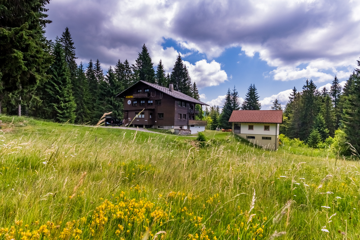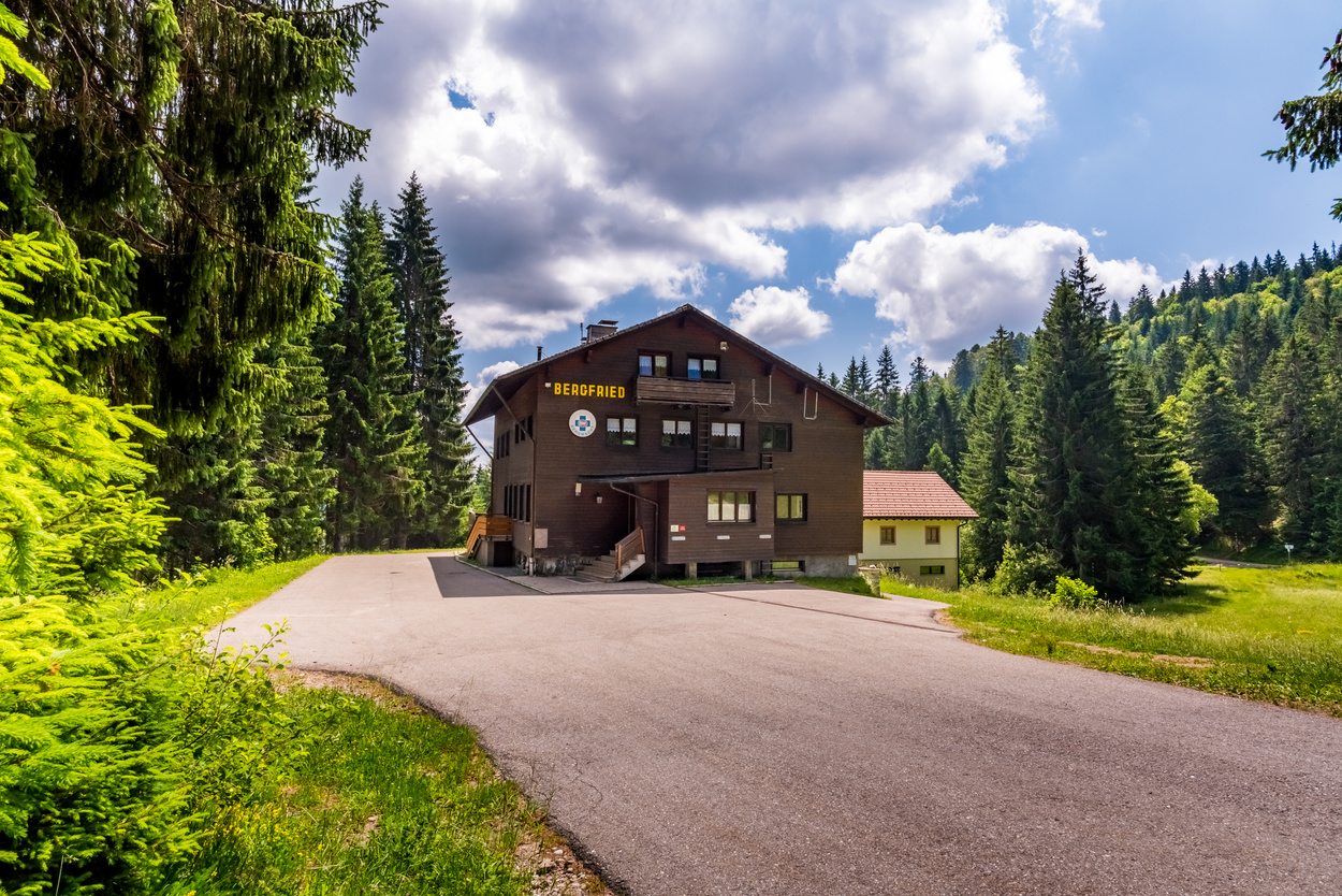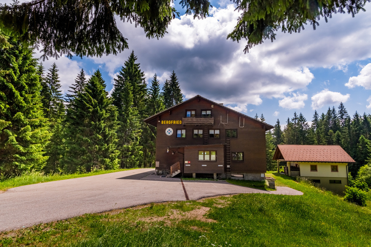 Außenbereich mit Holztische und Bänke sowie ein gemauerter Grill im Hintergrund das Haus Bergried umgeben von grünen Bäumen - Außenansicht des Haus Bergfried  - blühende Sommerwiese im Hintergrund das Haus Bergfried und grüne Nadelbäume  - Außenansicht mit Haupteingang des Haus Bergfried - Außenansicht mit Haupteingang des Haus Bergfried und geteertem Weg  -