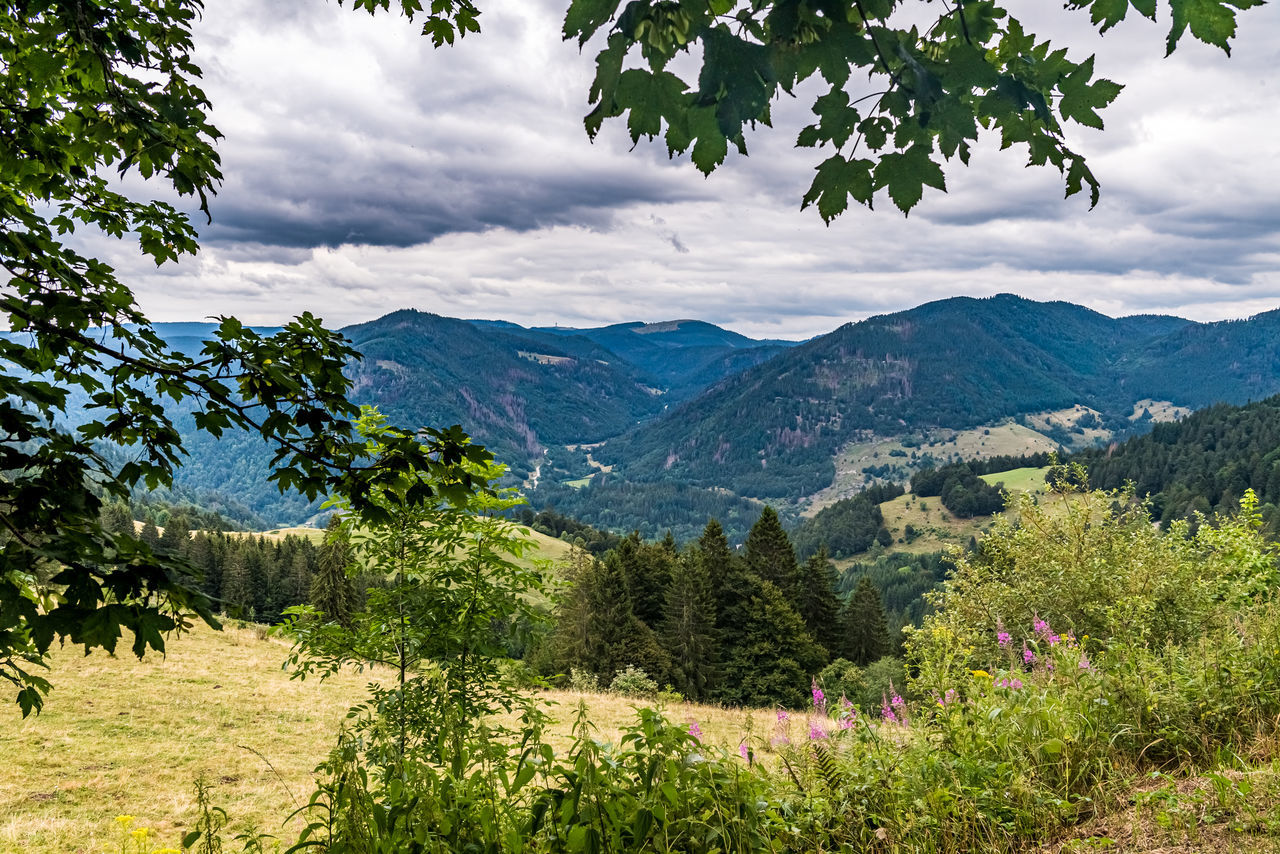 Motorradgruppe fährt durch eine Kurve auf einer Straße im SchwarzwaldMotorradfahrer beim Stopp genießt den herrlichen Ausblick auf den SüdschwarzwaldBlick in Richtung Feldberg und dem HerzogenhornMotorradfahrer genießt sitzend auf dem Motorrad die Aussicht