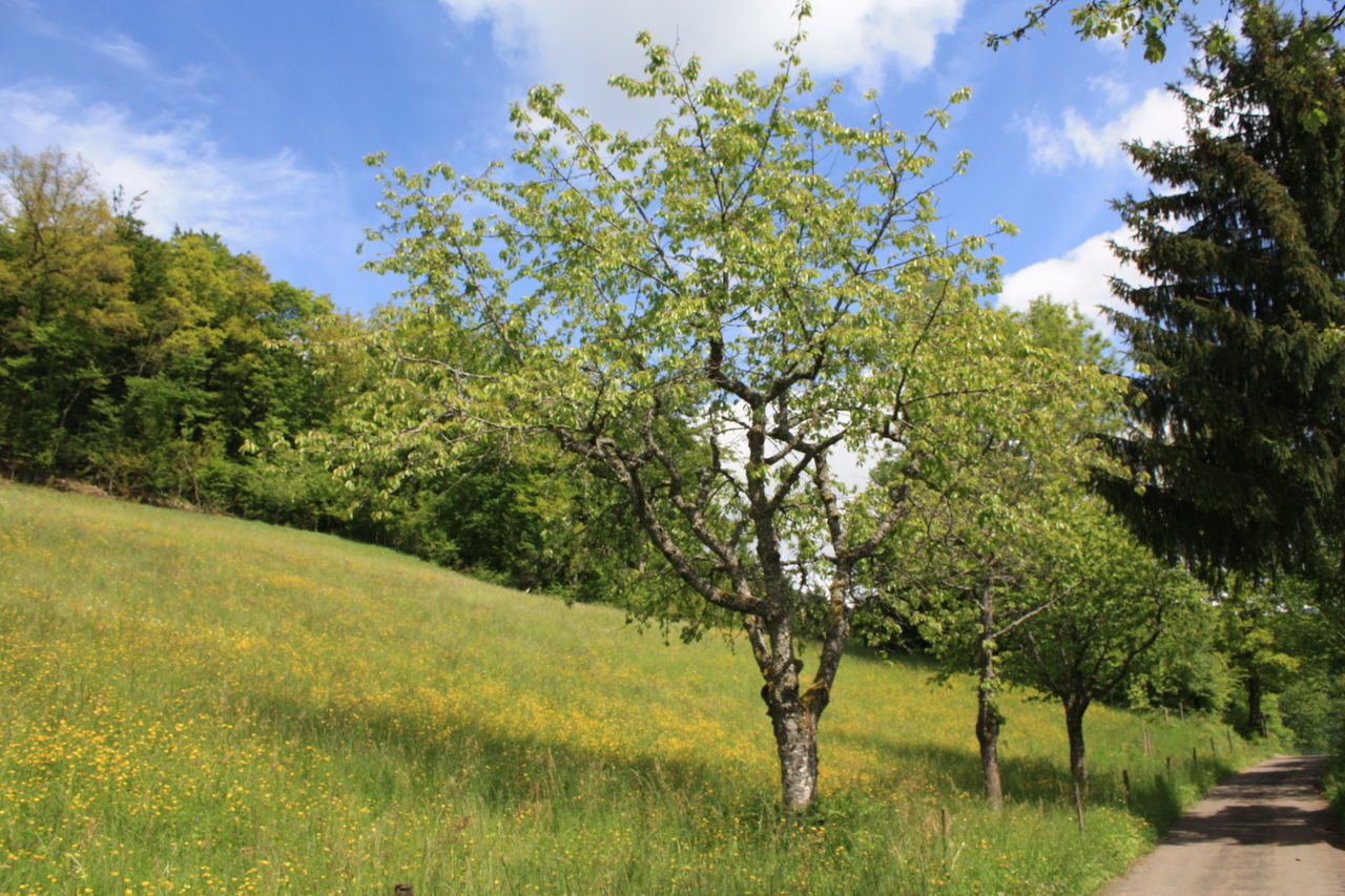 Blick auf WembachWohnhäuser in Wembach umringt von grünen WiesenSommerwiese mit KirschbaumDer Segerhof in Wembach